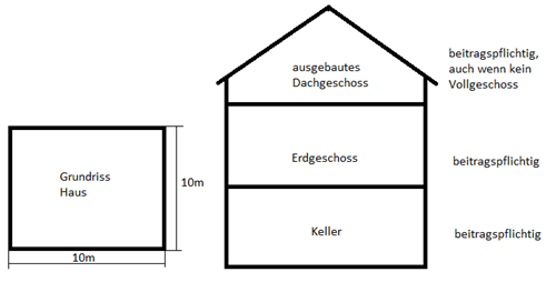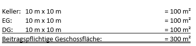 Nachstehende Berechnungsbeispiele sollen eine Hilfe zur Ermittlung der beitragspflichtigen Flächen darstellen. Es gilt zu beachten, dass es im Einzelfall natürlich Abweichungen geben kann. Die Beispiele dienen nur als Hilfe und sind nicht abschließend.