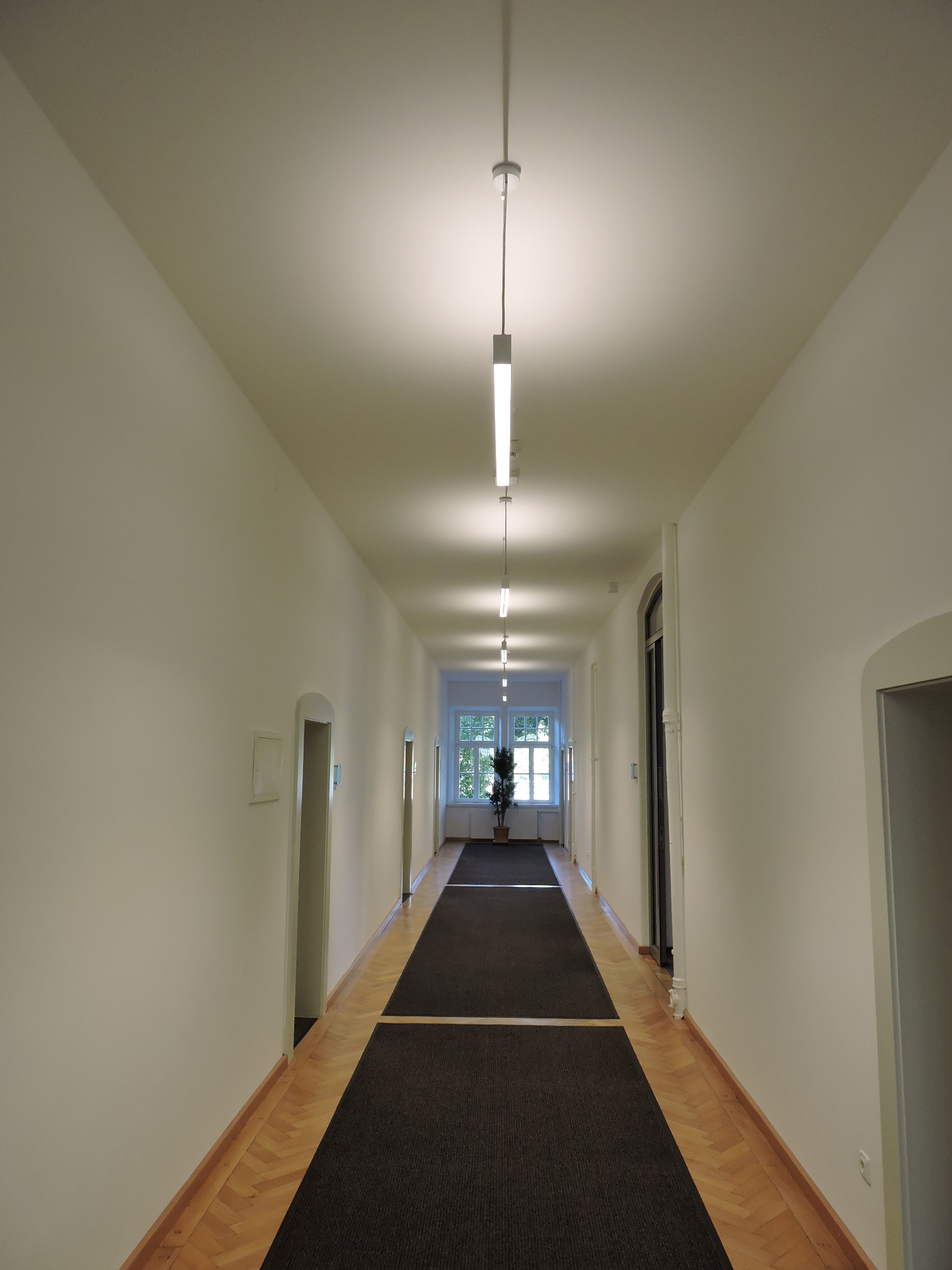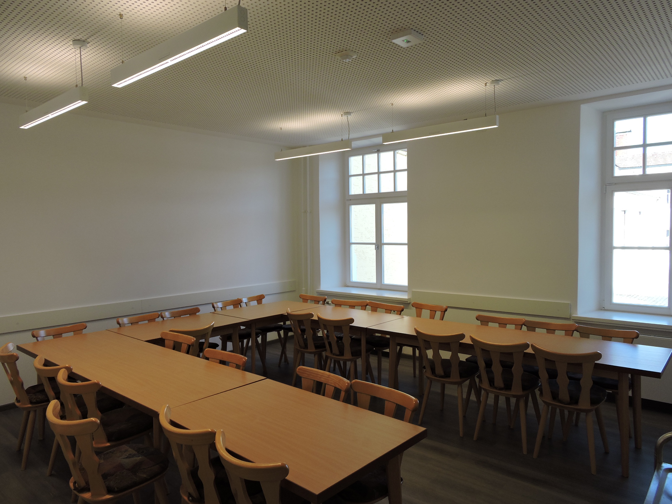 Im Zeitraum von August 2017 bis März 2018 erfolgte die Bauausführung. Bei laufendem Betrieb des Rathauses wurde im Zuge der Sanierungsmaßnahmen die alte Beleuchtungsanlage demontiert und eine neue LEDBeleuchtungsanlage mit tageslichtabhängiger Steuerung und Präsenzerkennung (modernes Lichtmanagement) installiert. Insgesamt wurden 88 neue LED-Leuchten mit einer Leistungsstärke zwischen 9 W und 48 W installiert. Die Beleuchtungsstärken wurden entsprechend der Nutzung zwischen 100lx bis 300lx gewählt.