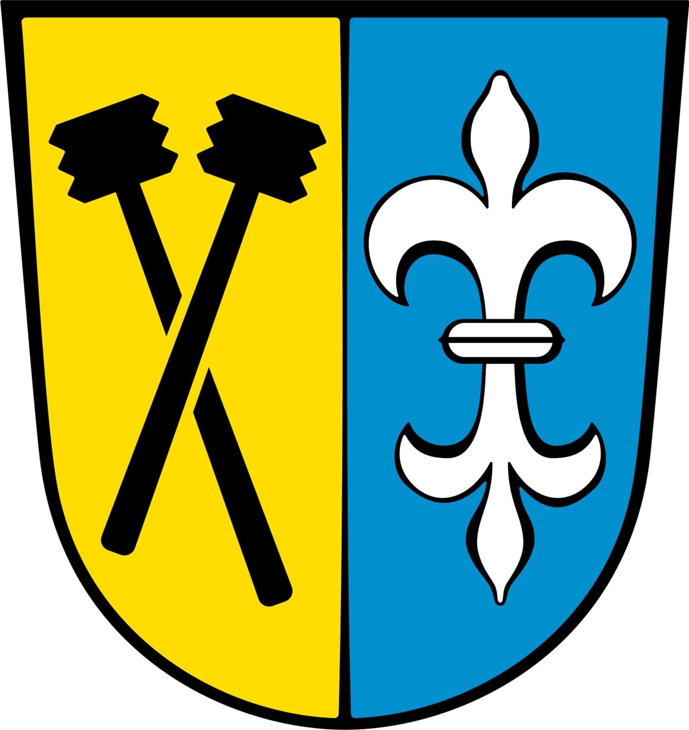- vorne zwei schräg gekreuzte schwarze Stockhämmer